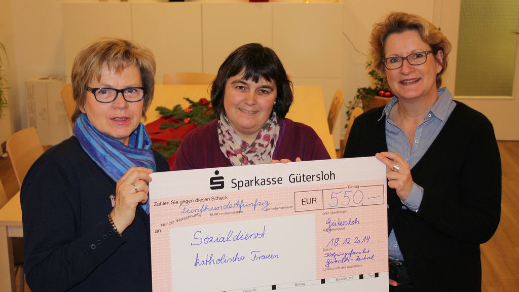 Stammkunden warten schon auf die beliebte Apfelsinen-Aktion, die die Kolpingfamilie Gütersloh-Zentral traditionell am 1. Advent organisiert. Nach den Gottesdiensten in den Pfarrgemeinden St. Pankratius, Heilig Geist und Liebfrauen wurden insgesamt 80 Apfelsinenkisten verkauft. Auch vorbestellte Kisten haben die Mitglieder der Kolpingfamilie ausgeliefert. Einen Scheck in Höhe von 550 € konnten die Kolpingvorstandsmitglieder Gisela Großewinkelmann und Stefanie Katczynski (von links) jetzt dem Sozialdienst katholischer Frauen Gütersloh e.V. (SkF) überreichen. „Wir freuen uns sehr über die großzügige Spende und danken dem Engagement der Kolpingfamilie ganz herzlich“, so die SkF-Vorsitzende Ursula Pantenburg. Die Spende kommt der Allgemeinen Sozialberatung des SkF zu Gute und trägt dazu bei, dass Menschen in Notsituationen schnell und unbürokratisch geholfen werden kann.
