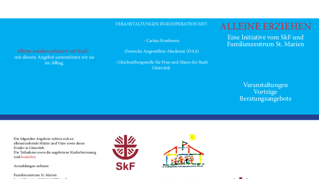 Im Rahmen des Jahresprogrammes für Gütersloher Alleinerziehende laden das Familienzentrum St. Marien und der Sozialdienst katholischer Frauen (SkF) am Samstag, den 05.09.2015 von 10:00 bis ca. 11:30 Uhr zu einem Vortrag zum Thema „Kinder und Geld“ ein. Rainer Bartonitschek, Mitarbeiter des SkFM Rheda-Wiedenbrück wird u.a. die Schuldnerberatung vorstellen, Hilfen bei Überschuldung und Tipps zum Taschengeld geben, sowie über das Konsumverhalten von Kinder und Jugendlichen berichten. Der Vortrag findet im Familienzentrum St. Marien, Unter den Ulmen 14a in Gütersloh statt und ist kostenlos. Die Kinder werden in dieser Zeit betreut. Anmeldungen nimmt Delia Spexard vom SkF unter 05241-9975741 oder d.spexard@skf-guetersloh.de entgegen.